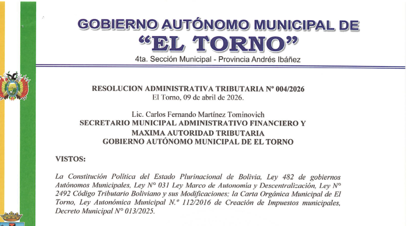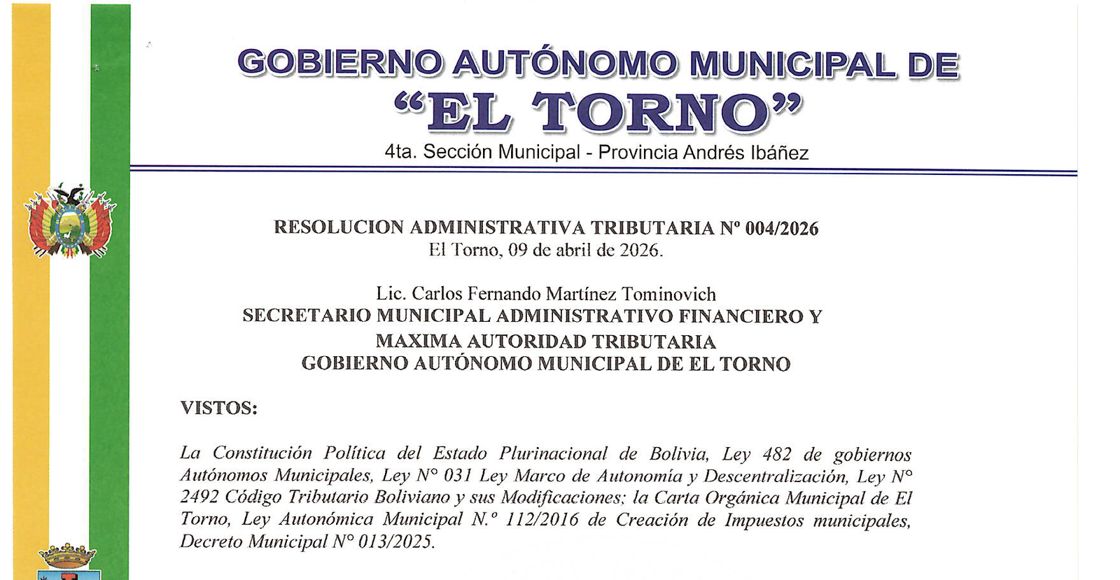 La Constitución Política del Estado Plurinacional de Bolivia, Ley 482 de gobiernos Autónomos Municipales, Ley No 031 Ley Marco de Autonomia y Descentralización, Ley N° 2492 Código Tributario Boliviano y sus Modificaciones; la Carta Orgánica Municipal de El Torno, Ley Autonómica Municipal N.° 112/2016 de Creación de Impuestos municipales, Decreto Municipal N° 013/2025.