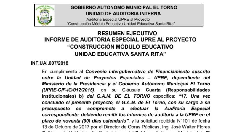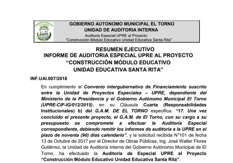 En cumplimiento al Convenio intergubernativo de Financiamiento suscrito entre la Unidad de Proyectos Especiales – UPRE, dependiente del Ministerio de la Presidencia y el Gobierno Autónomo Municipal El Torno (UPRE-CIF-IG/012/2015), en su Cláusula Cuarta (Responsabilidades Institucionales) b) del G.A.M. DE EL TORNO especifica: 17. Una vez concluido el presente proyecto, el G.A.M. de El Torno, con su cargo a su presupuesto se compromete a efectuar la Auditoría Especial correspondiente, debiendo remitir los informes de auditoría a la UPRE en el plazo de noventa (90) días calendario, y la solicitud recibida N°101 de fecha 13 de Octubre de 2017 por el Director de Obras Públicas, Ing. José Walter Flores Gutiérrez, la Unidad de Auditoría Interna del Gobierno Autónomo Municipal de El Torno, ha efectuado la Auditoria de Especial UPRE al Proyecto Construcción Módulo Educativo Unidad Educativa Santa Rita.
