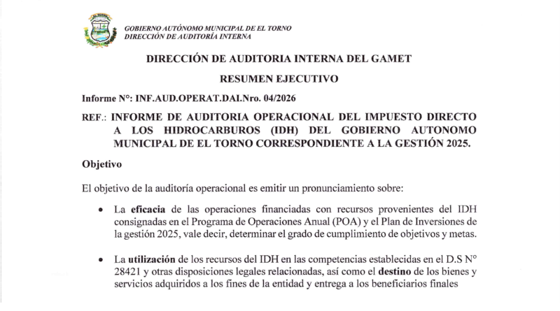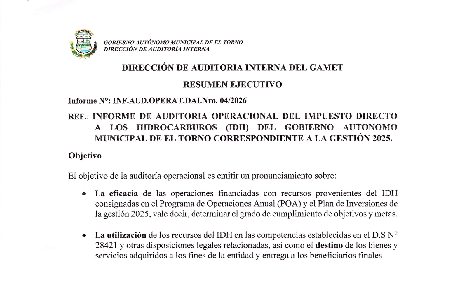 RESUMEN EJECUTIVO INFORME DE AUDITORIA OPERACIONAL DEL IMPUESTO DIRECTO A LOS HIDROCARBUROS (IDH) DEL GOBIERNO AUTONOMO MUNICIPAL DE EL TORNO CORRESPONDIENTE A LA GESTIÓN 2025.