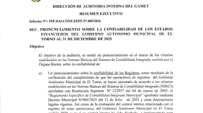 • RESUMEN EJECUTIVO PRONUNCIAMIENTO SOBRE LA CONFIABILIDAD DE LOS ESTADOS FINANCIEROS DEL GOBIERNO AUTONOMO MUNICIPAL DE EL TORNO AL 31 DE DICIEMBRE DE 2025
