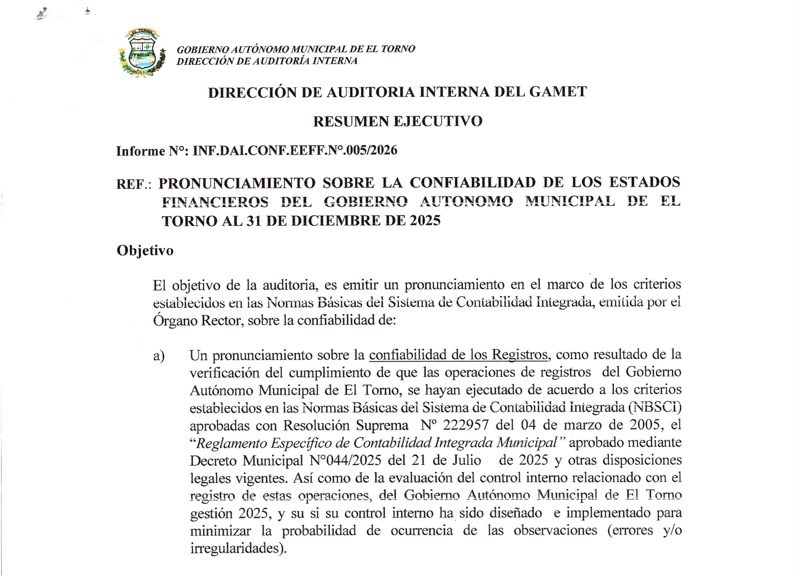 RESUMEN EJECUTIVO PRONUNCIAMIENTO SOBRE LA CONFIABILIDAD DE LOS ESTADOS FINANCIEROS DEL GOBIERNO AUTONOMO MUNICIPAL DE EL TORNO AL 31 DE DICIEMBRE DE 2025